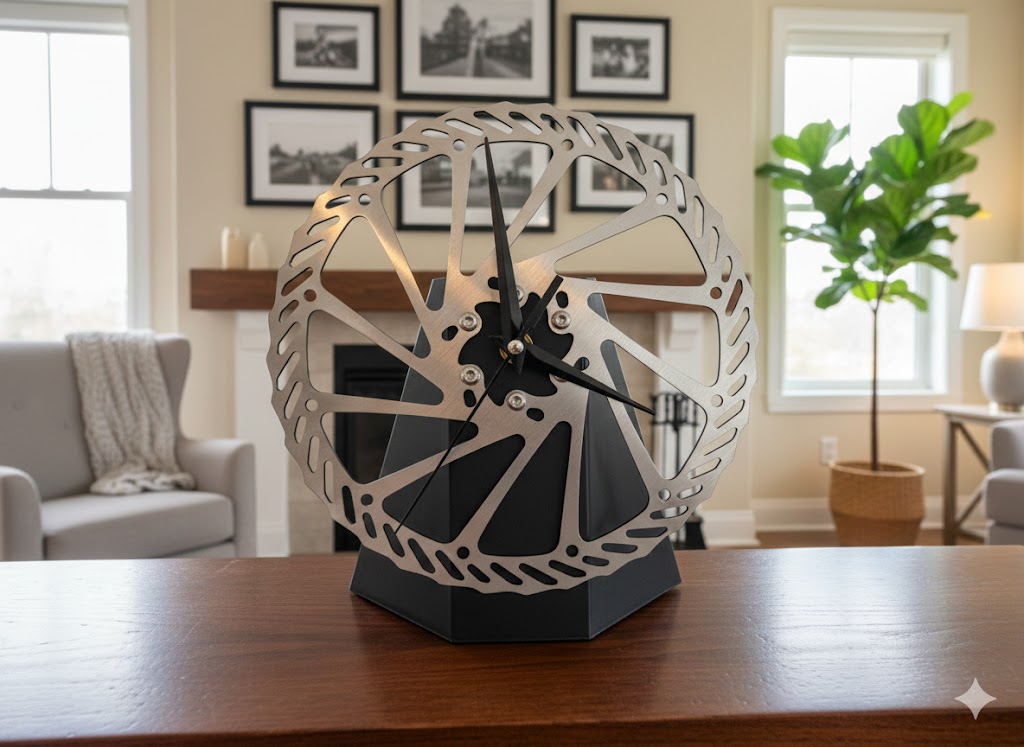 Die Fahrrad-Bremsscheiben-Uhr kombiniert Funktionalität und einen markanten Industrie-Look. Durch die Mischung aus echter Fahrradbremsscheibe und modernem 3D-Druck entsteht ein echter Hingucker.